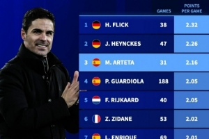 欧冠改制后主帅场均积分榜:弗里克居首,阿尔特塔第三,瓜帅第四