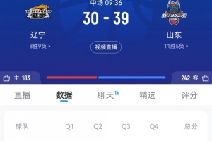 体育资讯1月23日讯 CBA常规赛,山东半场39-30领先辽宁。