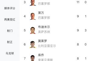 姆巴佩以21球领跑西甲射手榜,穆里奇14球暂排第二,费兰11球排第三。