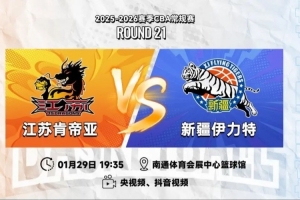 1月29日19:35,2025-26赛季CBA常规赛第二十一轮,江苏肯帝亚将回到主场南通体育会展中心篮球馆,迎来与新疆伊力特的三番战。