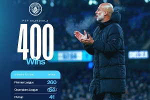 瓜帅执教曼城400胜分布:其中英超260场,欧冠64场,足总杯41场