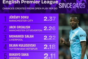 场均2.37次!多库领跑英超上赛季至今场均运动战创造机会榜