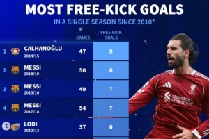 2010以来单赛季任意球进球:恰20居首、梅西二到四名,索博第22
