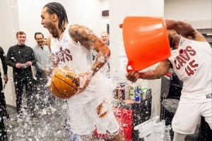 赛后,骑士官推晒图,泰森得到了本场的比赛用球,当家球星米切尔则泼水庆祝辛森的出色表现。