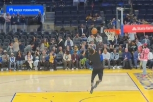 赛前,勇士球星库里进行热身,背身抛球助跑勉扣可惜未能成功。